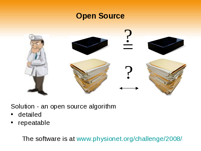 As in previous years, the Challenge will include an open source division. You may enter the open source division by sending your source code by email, before noon GMT on Monday, 1 September 2008, to PhysioNet. Use the subject line "Challenge 2008 entry source", and be sure to include: