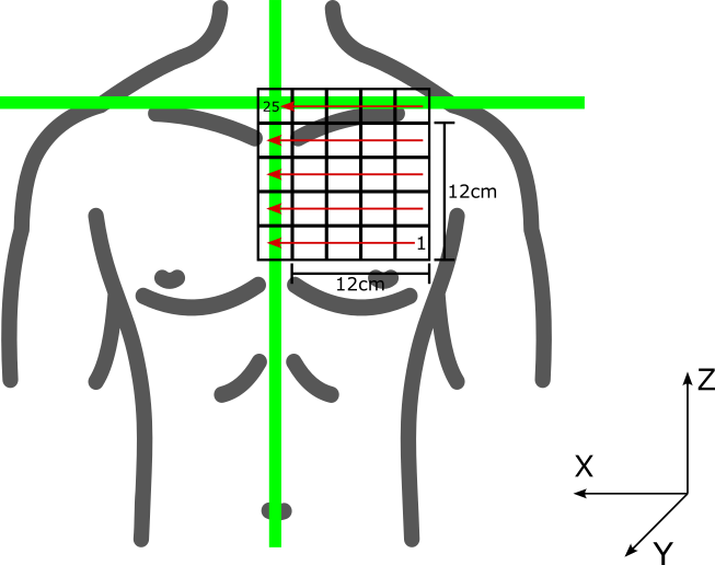 Each subject underwent 25 one-minute measurements, referred to below as trials, with different sensor positions, resulting in magnetic field recordings at 200 different positions for each subject. The subject remained lying on the patient bed while an operator moved the sensor array between measurements.