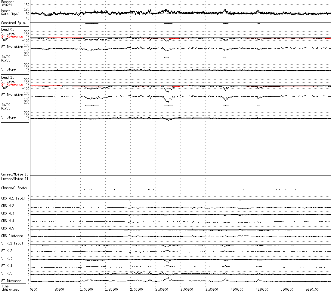 For each record, the numbers of ST episodes as determined by each of the three sets of criteria are summarized in an additional text file (with suffix .cnt). The deviation functions and the locations of the episodes are presented graphically in a set of trend plots here. Each record is represented by a 24-hour plot (_00-24.png) and by five 6-hour plots which overlap by one hour (_00-06.png, 05-11.png, etc.).