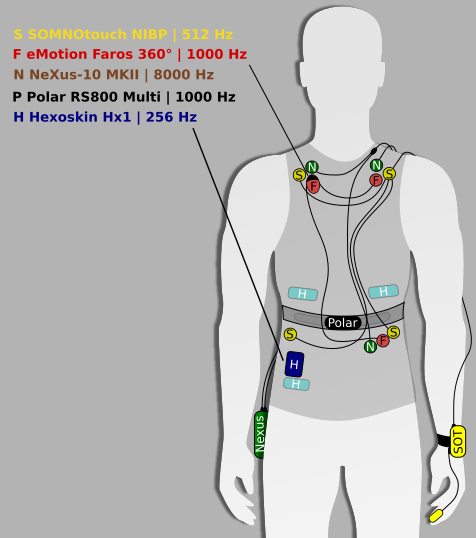 The resource consists of physiological recordings from 13 subjects with a sensor placement that enables simultaneous recording with all five devices used. Standard 3-lead ECGs were measured with NeXus, SOMNOTouch, Faros and Hexoskin. The latter uses textile electrodes, whereas others used standard Ag/Ag-Cl electrodes. Polar recorded identified heart beats by using a chest strap with flat electrodes made of conductive rubber. Beside ECG measurements further physiological parameters were tracked: heart rate, heart rate variability, photoplethysmogram, pulse, oxygen saturation, respiration, respiration rate, accelerometer, activity, and pedal frequency. Data from all five device were merged into a single file based on the common ECG measurement and a manual reference annotation of heart beats was generated. The usage of the dataset is manifold, e.g.: