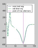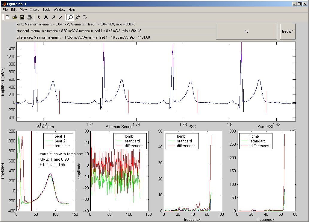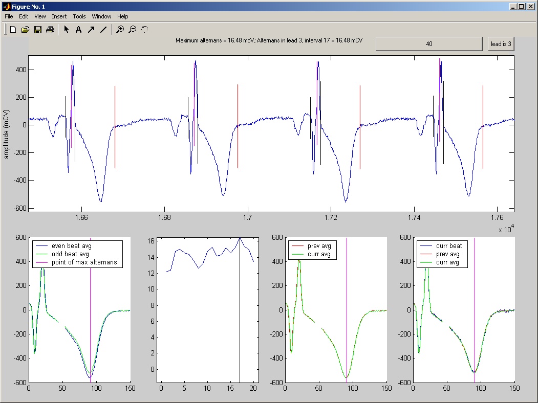 You are prompted to locate the ECG file you want to analyze. The MMA interface consists of ECG window, windows displaying superimposed even and odd averages for the current interval, alternans value trend and two windows containing (even and odd) averages for previous and current interval plotted against the current beat. Navigation is possible in the ECG and trend windows. One lead at a time is displayed. You can switch leads using the button at the upper right corner of the interface window. A text string summarizing the analysis results is displayed at the top of the window.